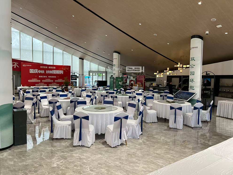 開封桌椅租賃以大圓桌(帶轉盤)與白色貴賓椅為核心物料,為2025商都阜園購房活動打造出兼具實用性與氛圍感的場地空間。