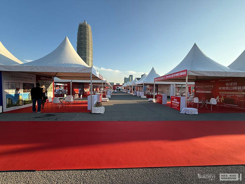 為打破傳統展廳的封閉感,周口篷房桌椅租賃在展會核心區域搭建了白色尖頂篷房。純白篷布搭配輕量化鋁合金支架,造型輕盈靈動,在展會現場形成醒目的視覺標識。多頂篷房沿主通道有序排列,既實現了參展房企的獨立展示,又通過開放式設計保持了展會整體的通透感,方便購房人群自由穿梭、對比咨詢。