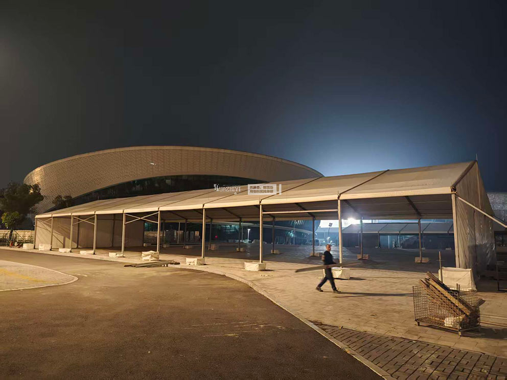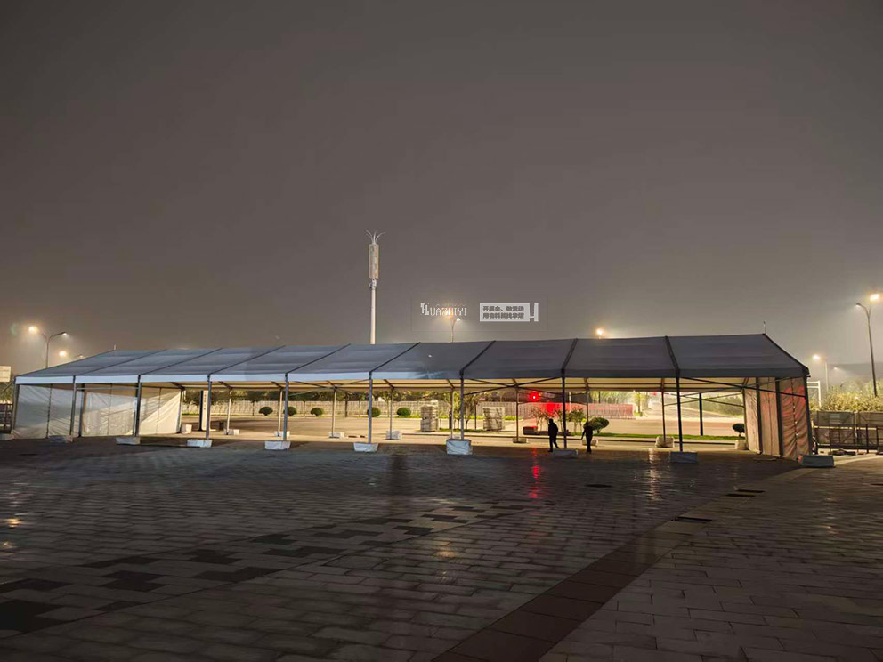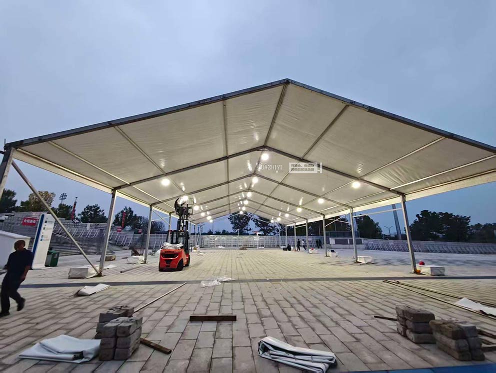 許昌篷房租賃精準把握演唱會安檢場景需求,搭建起白色人字形篷房,以通透開闊的結構、貼合潮流的設計,為安檢環節打造出“高效分流、氛圍融洽”的場地空間,成為洛陽潮燃星動演唱會安全有序開場的重要保障。