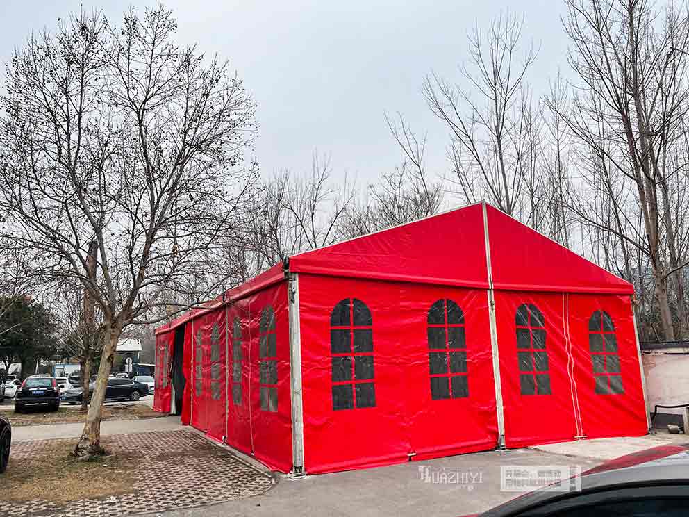 焦作篷房租賃選用高品質紅色篷布,色澤鮮亮飽滿、不易褪色,熱烈的紅色既彰顯了喜慶活力,又能快速融入演出場地的整體氛圍,為忙碌的演出人員營造出溫馨愉悅的用餐環境。篷房采用高強度鋁合金框架,經過精密焊接與防腐處理,結構扎實穩固,抗風防雨性能優異,可有效遮擋烈日、抵御突發風雨,為演出人員隔絕戶外惡劣天氣,打造安全、舒適的用餐避風港,適配各類戶外、臨時演出的用餐需求。